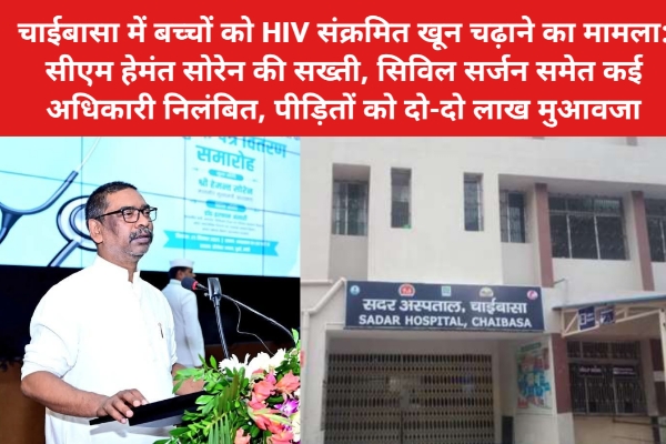 चाईबासा में थैलेसीमिया पीड़ित बच्चों को एचआईवी संक्रमित खून चढ़ाने की सूचना पर पश्चिमी सिंहभूम सिविल सर्जन समेत अन्य संबंधित पदाधिकारियों को निलंबित करने का निर्देश दिया है।