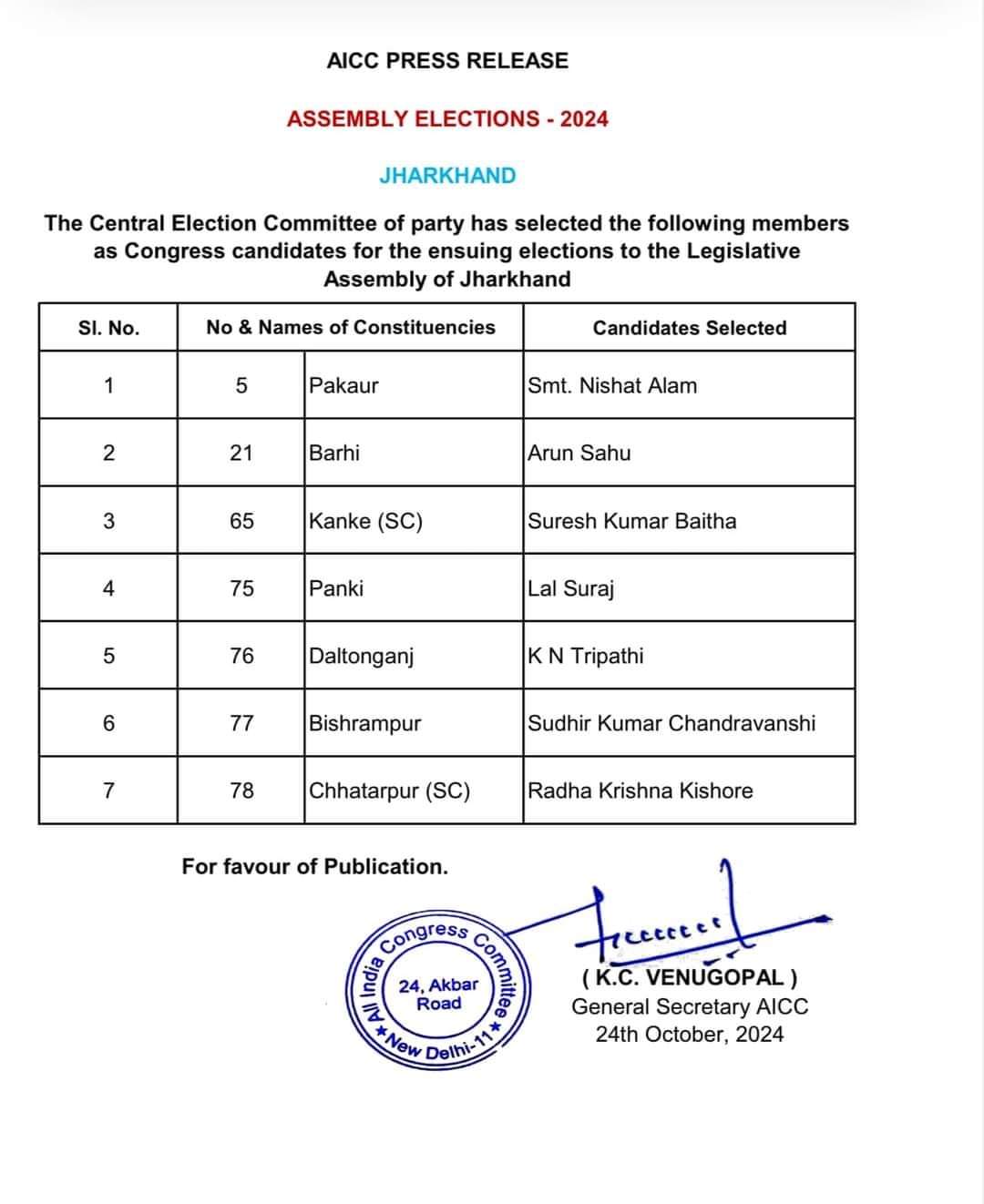 Jharkhand Vidhansabha Chunav 2024: झारखंड विधानसभा चुनाव 2024 के लिए कांग्रेस ने अपनी दूसरी सूची जारी कर दी है, जिसमें सात उम्मीदवारों के नामों की घोषणा की गई है। इस सूची में पाकुड़ से निशात आलम, बरही से अरुण साहू, कांके से सुरेश कुमार बैठा, पांकी से लाल सुरज, डालटनगंज से केएन त्रिपाठी, बिश्रामपुर से सुधीर कुमार चंद्रवंशी, और छतरपुर से राधा कृष्ण किशोर को टिकट दिया गया है। हालांकि, धनबाद और बोकारो के उम्मीदवारों की घोषणा अभी भी होल्ड पर है, जिससे इन क्षेत्रों के राजनीतिक समीकरणों में अनिश्चितता बनी हुई है।