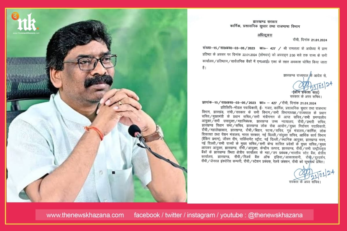 Ram Mandir: 22 जनवरी को अयोध्या राम मंदिर में प्राण प्रतिष्ठा समारोह को लेकर पूरा देश राममय हो गया है। झारखंड में भी इसे लेकर लोगों में खासी उत्साह देखी जा रही है। मुख्यमंत्री हेमंत सोरेन ने मुख्य सचिव को सरकारी स्कूलों व कार्यालयों में छुट्टी को लेकर निर्देश दिया है। जिसके तहत सरकारी स्कूलों को पूरे दिन बंद रखने का निर्देश दिया गया है। वहीं सभी सरकारी कार्यालय 2:30 बजे तक बंद रखने का निर्देश दिया गया है, वहीं  कार्मिक, प्रशासनिक सुधार तथा राजभाषा विभाग द्वारा अवकाश को लेकर रविवार को अधिसूचना जारी की गयी है। इसके अनुसार श्री रामलाल की अयोध्या में प्राण प्रतिष्ठा के अवसर पर सोमवार यानी 22 जनवरी को दोपहर 2:30 बजे तक झारखंड के सभी कार्यालय, सार्वजनिक बैंकों में एनआई एक्ट के तहत अवकाश घोषित किया जाता है।