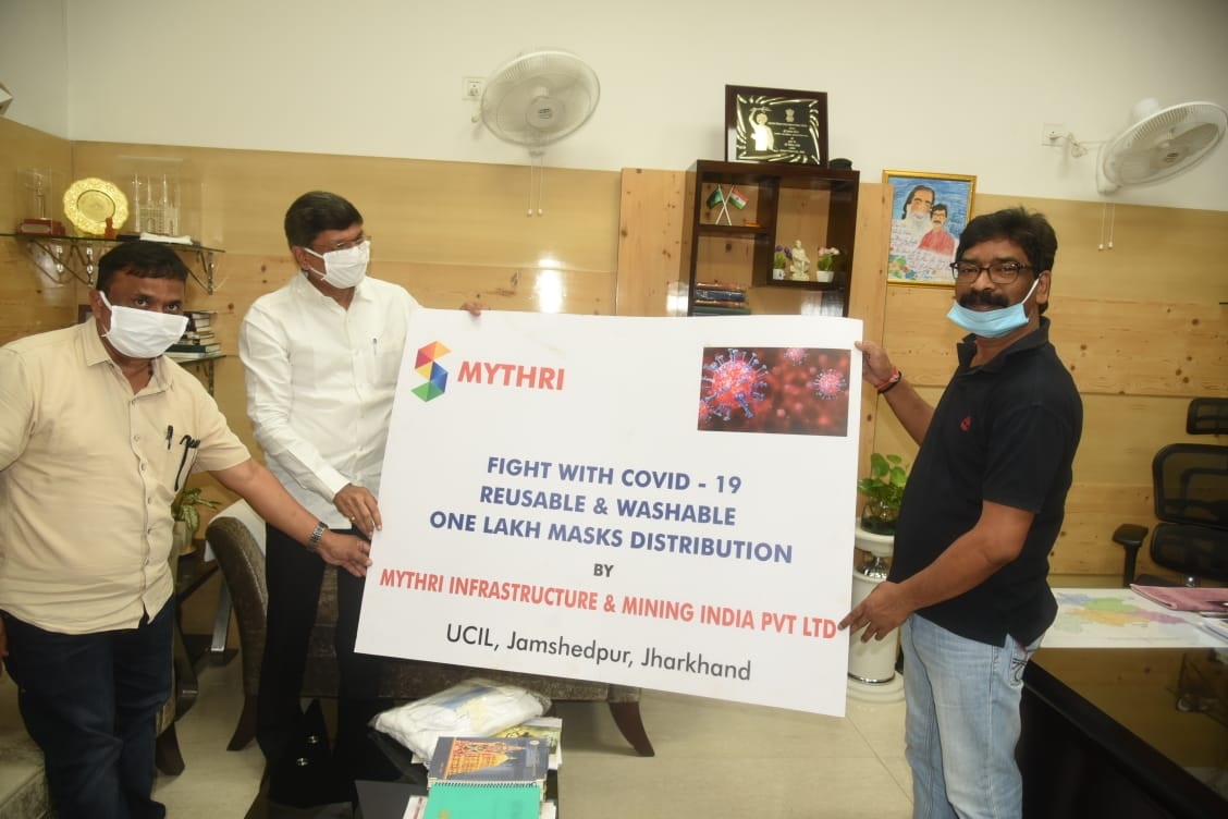 मुख्यमंत्री श्री हेमन्त सोरेन से आज कांके रोड स्थित मुख्यमंत्री आवास में मैत्री इंफ्रास्ट्रक्चर एंड माइनिंग इंडिया प्राइवेट लिमिटेड के चेयरमैन श्री टी श्रीनिवास राव ने मिलकर कोरोना वायरस (कोविड-19) से निपटने हेतू एक लाख वासेबल एंड री-यूज मास्क राज्य सरकार को सहयोग किया। इस अवसर पर मुख्यमंत्री ने कहा कि कोविड-19 संक्रमण से उत्पन्न संकट की इस घड़ी में सभी लोग एकजुट होकर वैश्विक महामारी में आपसी सहयोग और सद्भाव से अपनी भूमिका निभाएं।