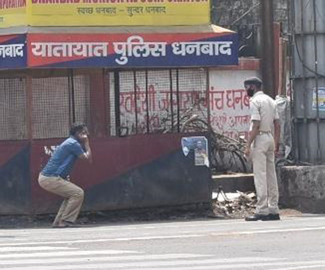 लॉकडाउन के दाैरान मंगलवार को धनबाद के रणधीर वर्मा चाैक पर कुछ लोग बैठकर शराब का आनंद ले रहे थे। पुलिस ने सबको दाैड़ाया। एक पकड़ में आया। उसे सजा स्वरूप कान पकड़ कर उठक-बैठक कराई गई। इसके बाद सीधे घर जाने की चेतावनी देकर छोड़ दिया गया।