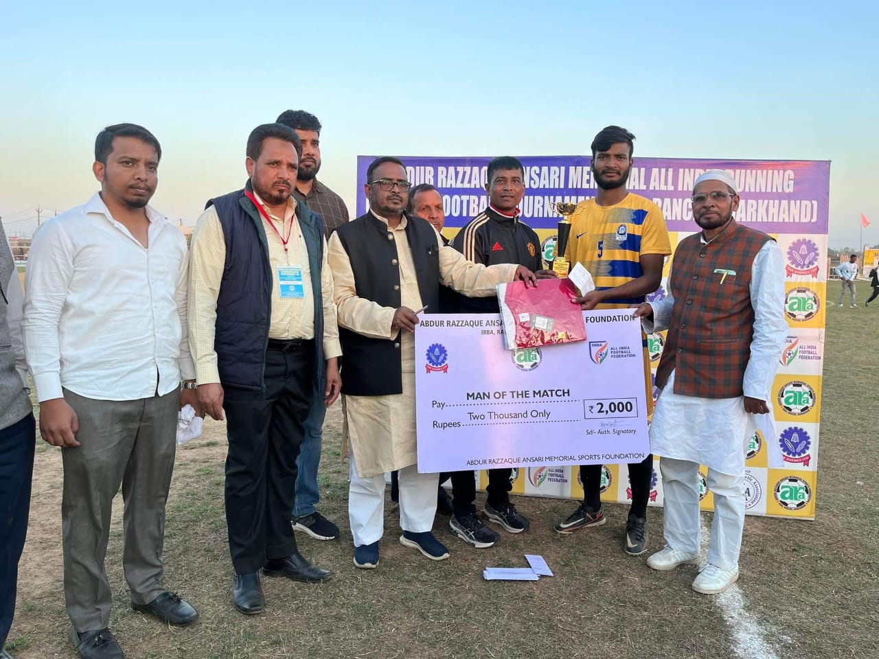 Ranchi: अब्दुर्रज्जाक अंसारी मेमोरियल स्पोर्ट्स फाउण्डेशन के द्वारा ऑल इण्डिया फुटबॉल फेडरेशन (AIFF) से निबंधित ऑल इण्डिया अब्दुर्रज्जाक अंसारी मेमोरियल रनिंग गोल्ड कप फुटबॉल टूर्नामेंट 2023 का आयोजन अब्दुर्रज्जाक अंसारी फुटबॉल ग्राउंड इरबा, राँची में दिनांक 30.01.2023 से 12.02.2023 तक किया जा रहा है। जिसका ग्रुप बी० का सेमिफाइनल मैच आज दिनांक 10.02.2023 को अब्दुर्रज्जाक अंसारी फुटबॉल ग्राउंड इरबा राँची में खेला गया मैच देखने के लिए मैदान में काफी संख्या में स्थानीय फुटबॉल प्रेमी एवं दूर-दराज से दर्शक आये हुए थे और मैदान दर्शकों से खचाखच भरा हुआ था. आज का दूसरा सेमी फाइनल मैच ईस्ट सेंट्रल रेलवे, समस्तीपूर बिहार एवं राइजींग फुटबॉल क्लब, हजारीबाग, झारखण्ड के बीच खेला गया। दोनों ही टीमों के द्वारा बेहतरीन खेल का प्रदर्शन किया गया। पूरे मैच में दोनों ही टोमों द्वारा गोल करने का बहुत प्रयास किया गया, परन्तु वे गोल करने में सफल नहीं हो पाये। इसके बाद मैच का नतीजा पेनाल्टी शूट आउट के द्वारा हुआ पेनाल्टी शूट आउट में बेहतरीन गोल कर बिहार की टीम विजय हुई। मैच में शानदार प्रदर्शन करते हुए मैन ऑफ द मैच की ट्रॉफी प्रोत्साहन राशि एवं टी शर्ट जर्सी न० 05 मंजीत करमाली ने हासिल किया। दिनांक 12.02.2023 को फाइनल मैच ईस्ट सेंट्रल रेलवे, समस्तीपूर, बिहार एवं हुलहुण्डु एफ. सी. राँची, झारखण्ड के बीच ठीक 2:00 बजे दोपहर से खेला जाएगा। कार्यक्रम में मुख्य अतिथि के रूप में अब्दुर्रज्जाक अंसारी मेमोरियल स्पोर्ट्स फाउण्डेशन, इरबा, राँची के अध्यक्ष अनवार अहमद अंसारी, मंजूर अहमद अंसारी, इश्तेियाक अंसारी, सरफुल हक अली, फिरोज अहमद अंसारी, आफताब आलम, मतिउर रहमान, मुजतबा अंसारी, फहीम अख्तर आदि व्यक्ति उपस्थित थे.