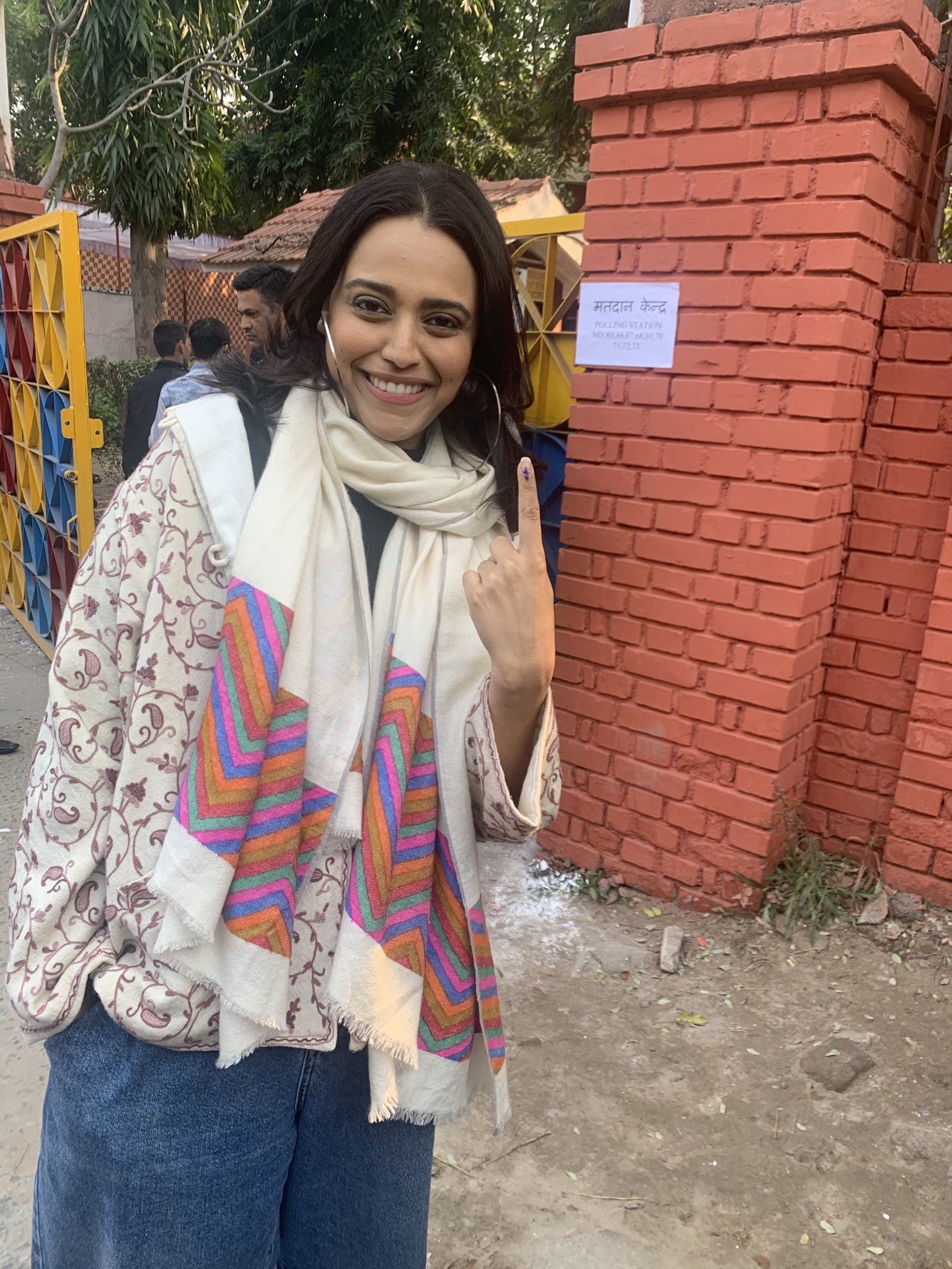 स्वरा भास्कर ने दिल्ली विधान सभा के चुनाव में अपने मताधिकार का प्रयोग किया। वोट करने के बाद स्वरा भास्कर ने ट्विटर पर अपनी एक फोटो शेयर की और कैप्शन में लिखा, “मैंने वोट कर दिया। आपने किया क्या?” स्वरा भास्कर फोटो में उंगली पर लगा स्याही का निशान दिखा रही हैं।